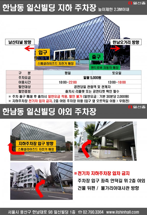 주차장 이용 및 금액은 어떻게 되나요? 페이지 정보 작성자 일신홀 작성일18-05-31 11:30 조회27,068회 댓글0건 관련링크 이전글 다음글 목록 본문 주소 : 서울시 용산구 한남대로 98(한남동 714) 일신빌딩 1층 Tel : 02-790-3364 이전글 다음글 목록